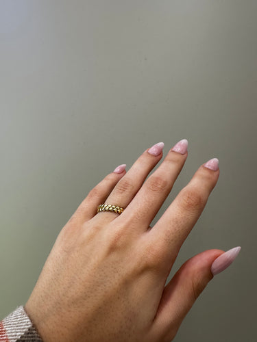 Ein eleganter Leaf Ring, der mit seinem minimalistischen Design jedes Outfit veredelt. Der zarte Goldschimmer verleiht ihm einen edlen Charakter – perfekt für jeden Anlass.