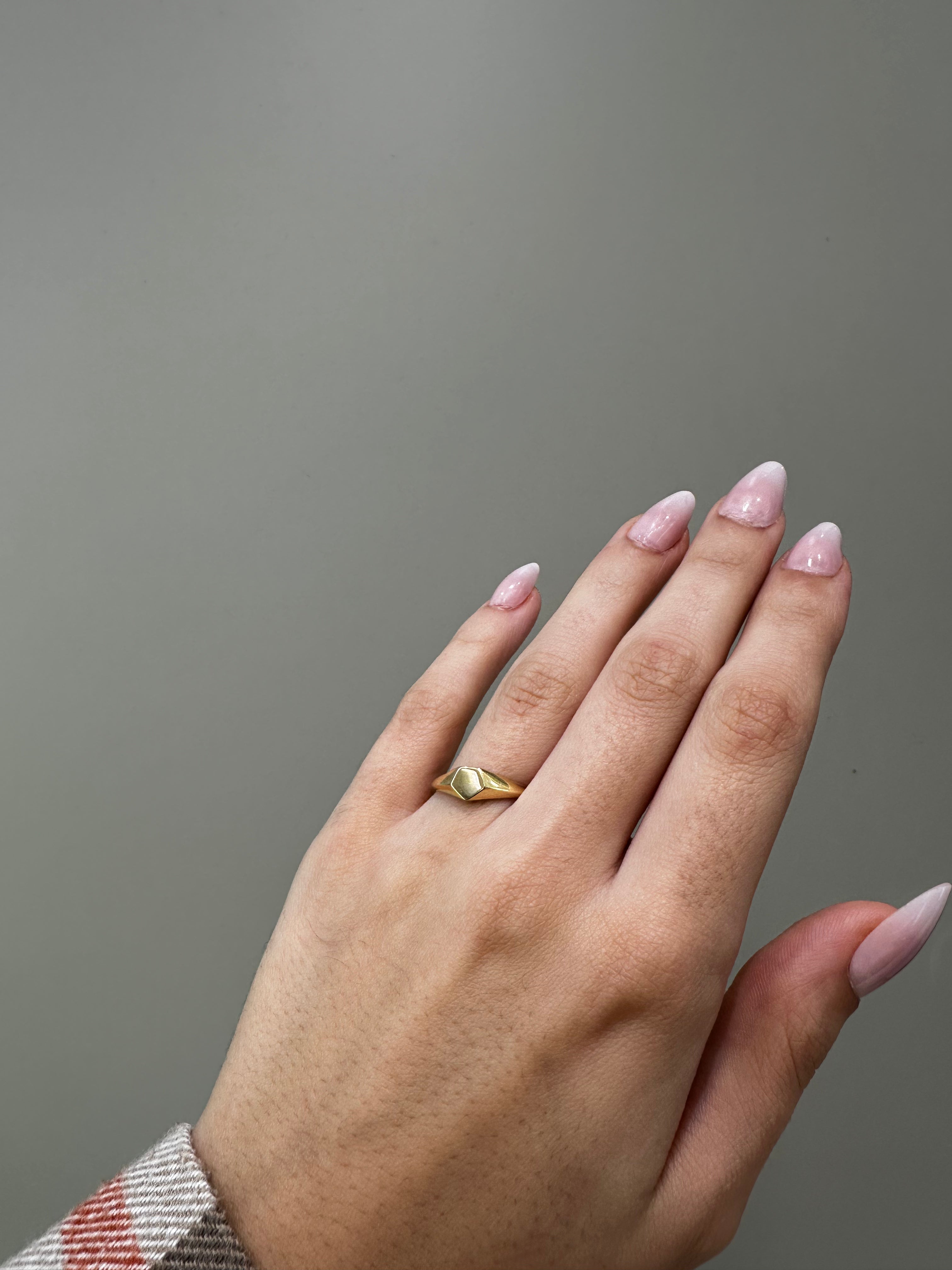 Ein eleganter Pentagon Ring, der mit seinem minimalistischen Design jedes Outfit veredelt. Der zarte Goldschimmer verleiht ihm einen edlen Charakter – perfekt für jeden Anlass.