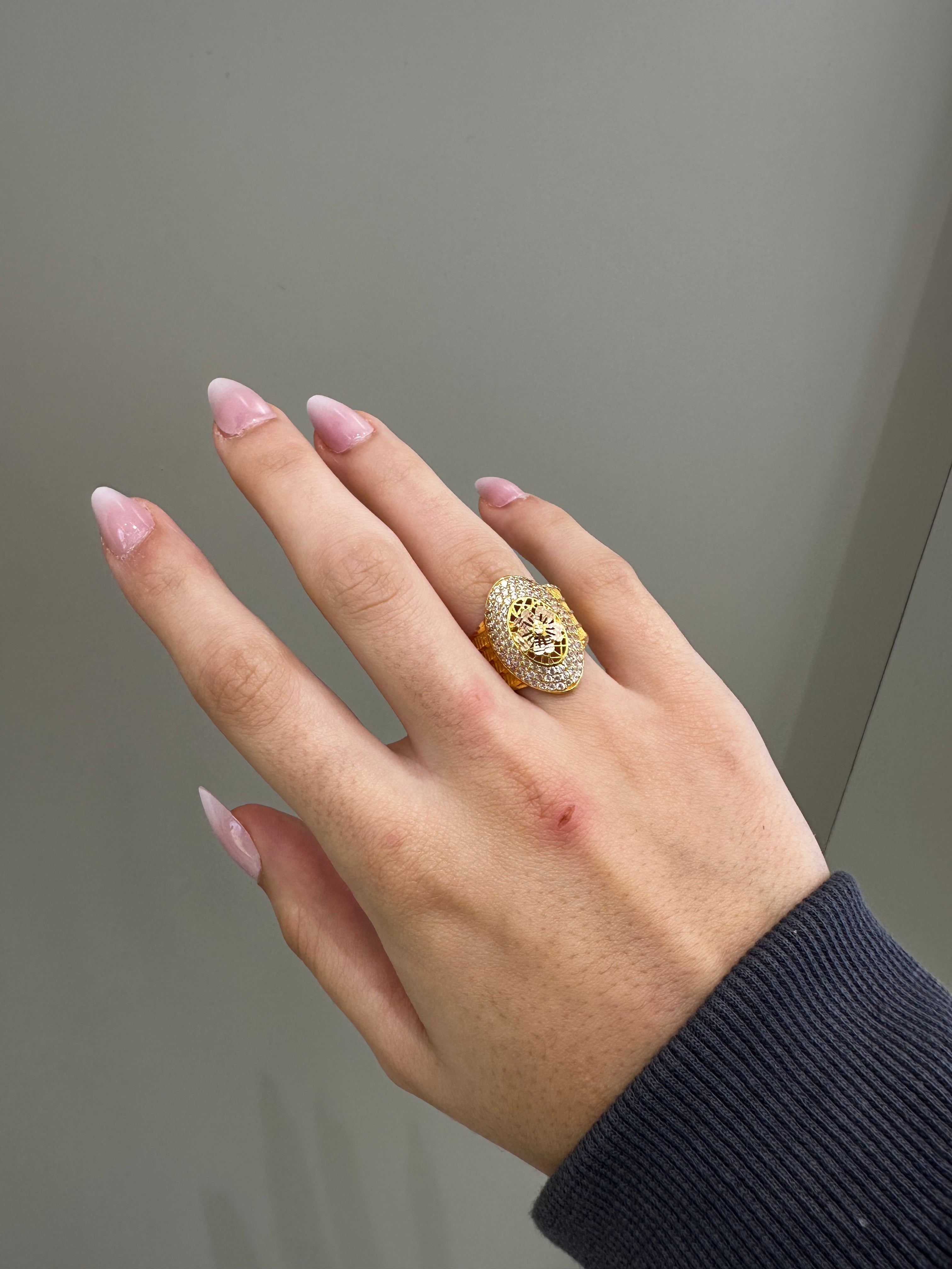 Hol dir einen eleganten Om Ring aus Gelbgold. Dieser goldener Om Ring ist mit einem Symbol und Zirkonia verziert.